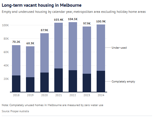 2024年墨尔本的“长期闲置”房源(包括空置与使用不足)达到100,945套,比上一年再增 3%。