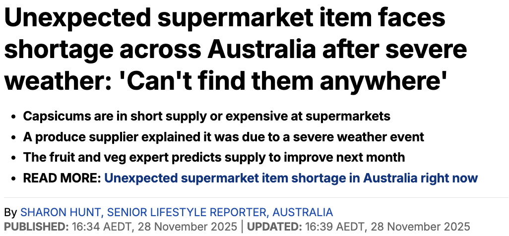 2025年澳洲已经出现多次蔬果短缺事件,原因均与不同的天气灾害有关。