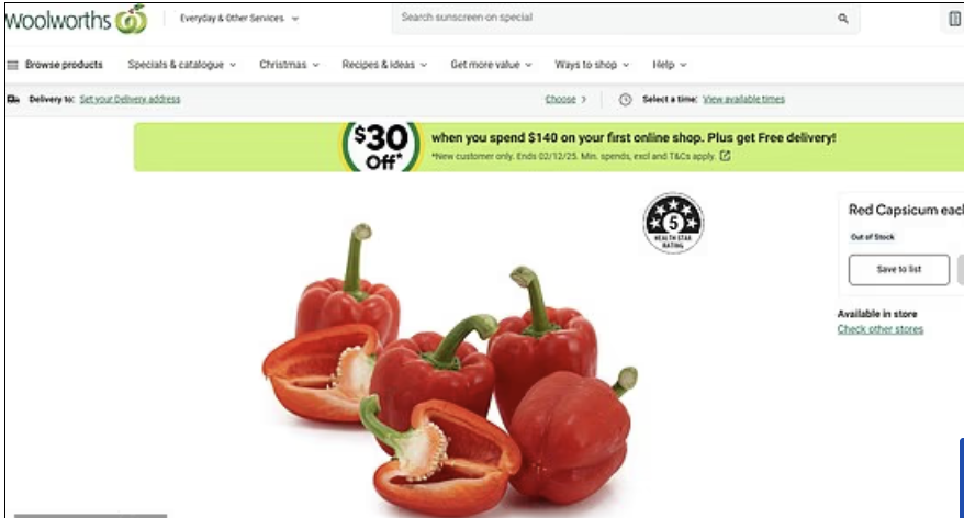 同时,Woolworths的网购页面显示红椒“缺货”。