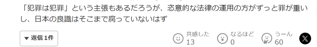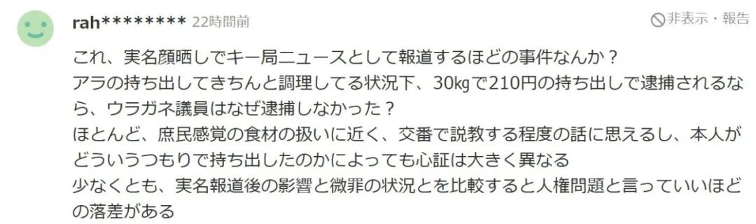 “这件事真值得以实名、露脸的方式登上电视台的主流新闻吗?在把鱼下脚料带回去经过妥善处理、认真烹调的情况下,仅仅30公斤、210日元的持有就被逮捕,那为什么政治人物黑金议员当初就没有被逮捕呢?在大多数人看来,这几乎就是普通老百姓处理食材的感受,交警或派出所里教育一番可能就够了。个人持有的意图也会极大影响公众的判断。至少,从实名报道造成的社会影响和事实上的轻微违法行为相比,这种落差几乎可以称作人权问题。有人可能会说犯罪就是犯罪,但恣意运用法律、选择性执法的伤害更大。日本的社会良知应该不至于腐化到这种程度吧?”