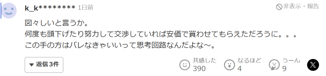 “说是脸皮厚也好。要是她肯多低几次头,多花点心思去好好谈,说不定就能以很便宜的价格买到了……可这类人往往就是抱着只要不被发现就没问题的思维方式啊。”