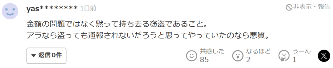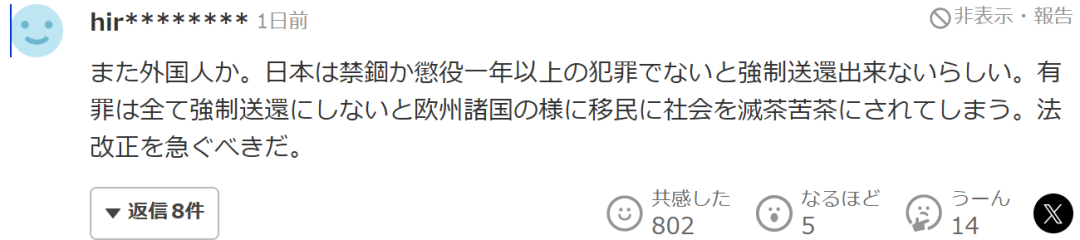 “又是外国人啊。据说日本只有在犯下判处一年以上监禁或有期徒刑的犯罪时,才可能强制遣返。我觉得所有有罪外国人都应该被遣返,否则像欧洲一些国家那样,移民可能会把社会弄得一团糟。应该加快法律修订。”