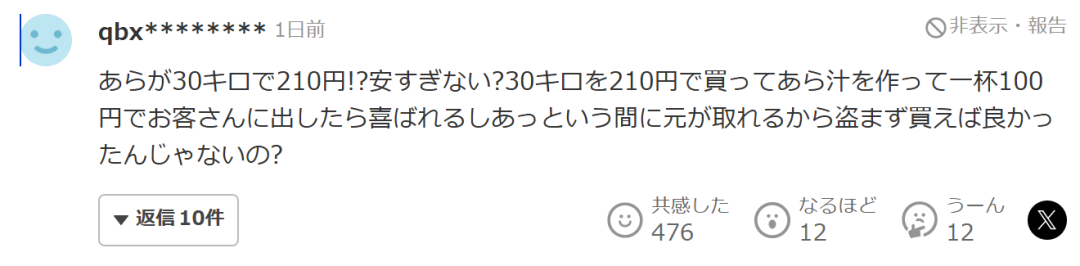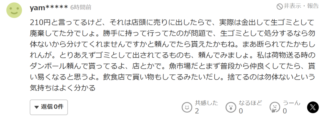 “虽然说是210日元的价值,但那只是按如果拿去店里出售来计算的价格,实际上这些东西本来是要花钱当厨余垃圾处理掉的。真正的问题在于她未经允许就擅自拿走这件事。如果是作为要被当垃圾处理的东西,提前去问一句'这么扔掉太可惜了,能不能分我一点?'的话,说不定还真的会给她。当然,也可能会被拒绝就是了。