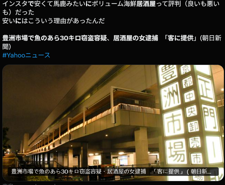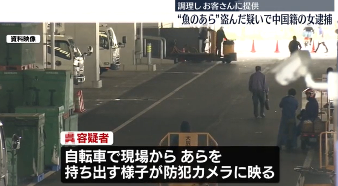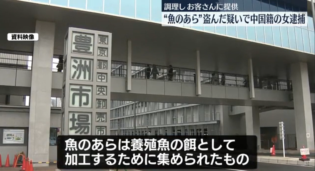 一名年过六旬的中国女性,因夜间擅自进入丰洲市场,盗取原本用于养殖鱼饲料加工的鱼类边角料(主要是鱼骨头等),并将其带回自己经营的居酒屋加工后提供给顾客,被警方以窃盗和非法侵入建筑物的嫌疑当场逮捕。