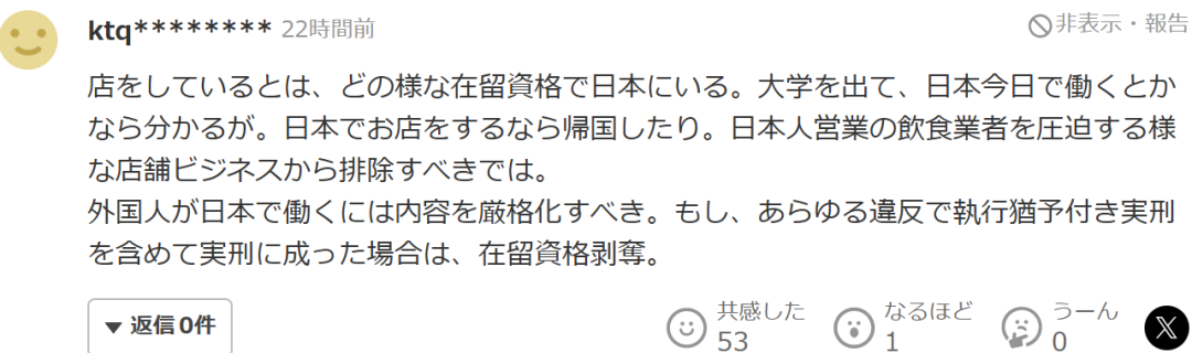 “她在日本开店,是持什么样的在留资格呢?如果是大学毕业后在日本工作的情况还能理解,但要是在日本长期经营店铺的话,通常就应该回国了。应该排除那些以外国人身份经营、对日本本地餐饮业者造成压力的商业行为。外国人在日本工作,应该对从事的内容进行严格限制。如果因各种违法行为被判处实刑,包括缓刑在内,就应该剥夺其在留资格。”