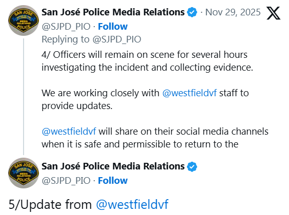 圣荷西警察局局长保罗·约瑟夫(Paul Joseph)强调:“在购物高峰日于拥挤商场发生枪击事件令人深感忧虑。为了安抚民众,我们将在整个周末增加巡逻力度。同时侦探正在全力锁定嫌疑人,我相信嫌犯将会被迅速绳之以法。”