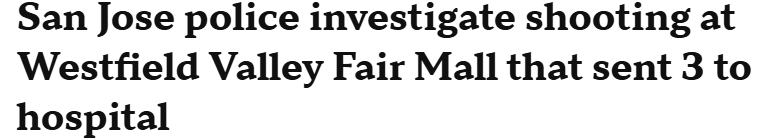 美国加州圣荷西警方表示,当地时间“黑色星期五”傍晚,位于圣荷西的 Westfield Valley Fair 购物中心发生枪击事件,导致三人中弹受伤,被紧急送往医院。所幸三人伤势均未危及生命。