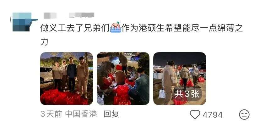 还有年轻人自发冲到第一线:“做义工去了兄弟们????????作为港硕生希望能尽一点绵薄之力。”