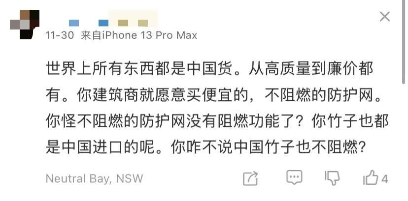 也有人从更现实的角度出发,质问:“世界上所有东西都是中国货,从高质量到廉价的都有。你建筑商就愿意买便宜的、不阻燃的防护网。你怪不阻燃的防护网没有阻燃功能了?你竹子也都是中国进口的呢。你咋不说中国竹子也不阻燃?”