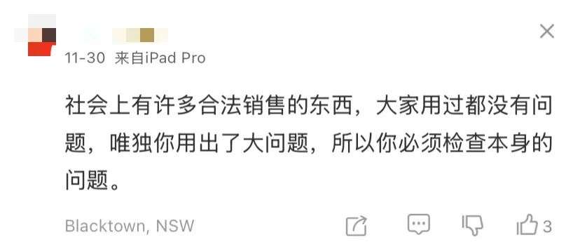 还有人甚至直接点出了矛盾核心:“社会上有许多合法销售的东西,大家用过都没有问题,唯独你用出了大问题,所以你必须检查本身的问题。”