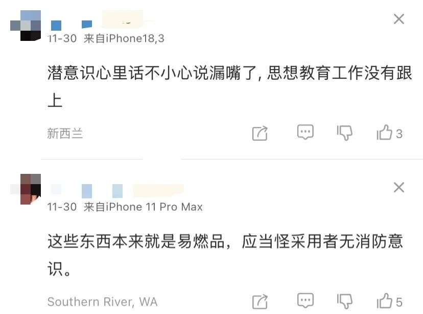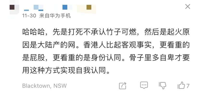 甚至有网友直接怒怼:“哈哈哈哈,先是打死不承认竹子可燃,然后是起火原因是大陆产的网。香港人比起客观事实,更看重的是屁股,更看重的是身份认同。骨子里多自卑才要用这种方式实现自我认同。”