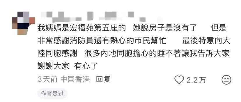 “我姨妈是宏福苑第五座的 她说房子是没有了 但是非常感谢消防员还有热心的市民帮忙 最后特意向大陆同胞感谢 很多内地同胞揪心的睡不着让我告诉大家谢谢大家 有心了。”