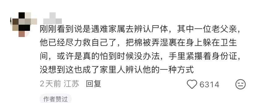 “刚刚看到说是遇难家属去辨认尸体,其中一位老父亲,他已经尽力救自己了,把棉被弄湿裹在身上躲在卫生间,或许是真的怕到时候没办法,手里紧攥着身份证,没想到这也成了家里人辨认他的一种方式。”