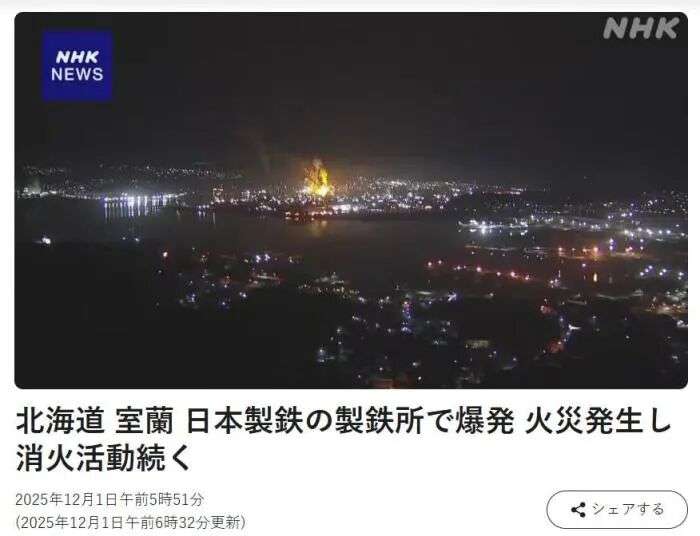 据日本广播协会(NHK)报道,当地时间12月1日凌晨,位于日本室兰市的“日本制铁”公司一家钢铁厂发生爆炸,随后引发大火。