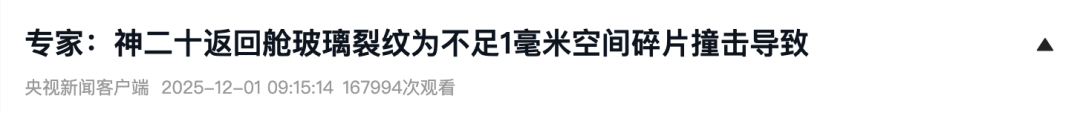专家:神二十返回舱玻璃裂纹为不足1毫米空间碎片撞击导致。