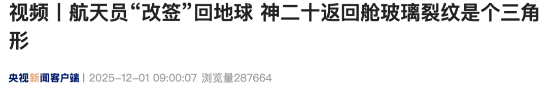 航天员“改签”回地球,神二十返回舱玻璃裂纹是个三角形