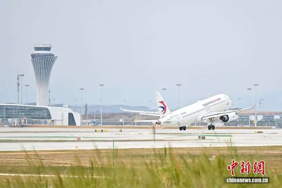 资料图:10月30日,广州白云国际机场第三座航站楼(T3航站楼)、第五跑道正式投入运行,标志着该机场进入“五条跑道+三座航站楼”运行时代,并成为中国民航首个五条商用跑道同时运行的机场。图为首航航班在第五跑道上起飞。中新社记者 陈骥旻 摄