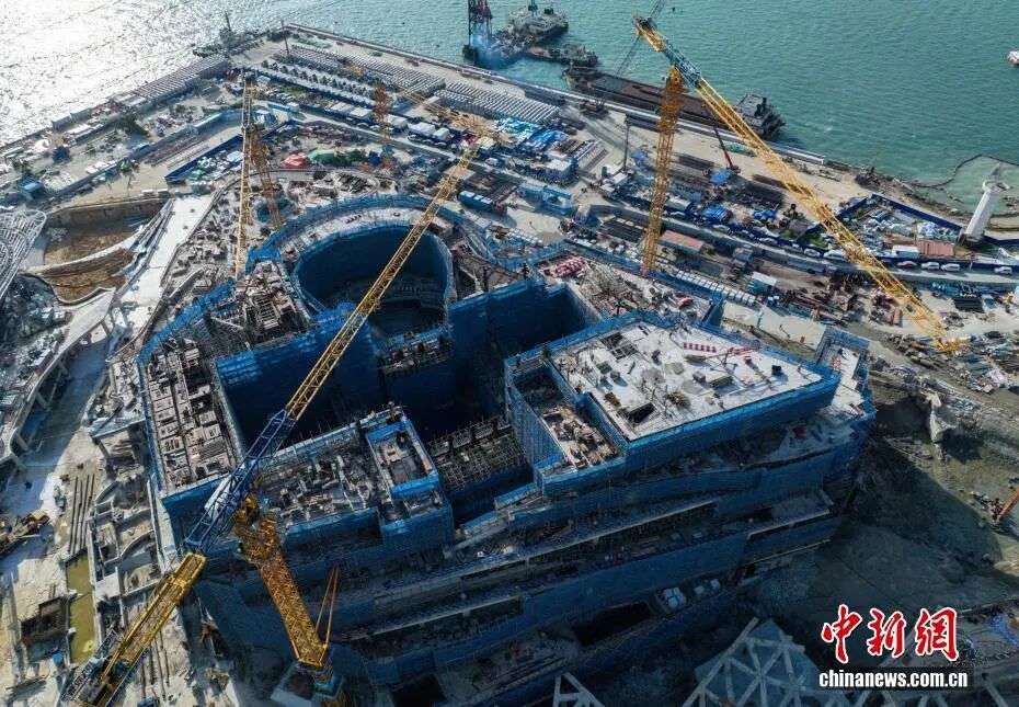 资料图:11月22日,海南三亚,海南国际文化交流中心项目施工现场。海南国际文化交流中心项目于11月21日实现主体结构封顶,标志着这一海南自贸港文化新地标建设迈入关键阶段。(无人机照片)中新社记者 骆云飞 摄