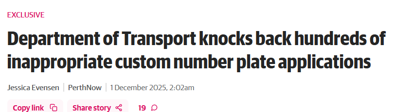 素材来源:https://www.perthnow.com.au/wa/department-of-transport-knocks-back-hundreds-of-inappropriate-custom-number-plate-applications-c-20848554