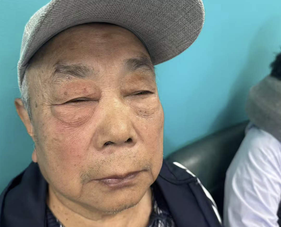 当老人拿出手机想录影时,员工竟冲上去抢手机过程中老人眼部被击中,立刻红肿。