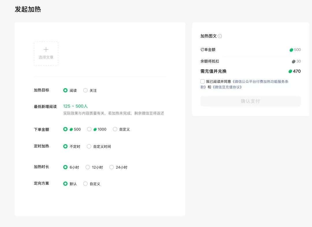 具体来看,“付费加热”功能可以选择提升阅读量或者增加新关注。这一功能需要付费,通过微信豆的方式购买。例如,500个微信豆,可以选择新增阅读125-500人。红星资本局注意到,1元可以购买10个微信豆,按此估算,新增一个阅读大概需要0.1-0.4元。