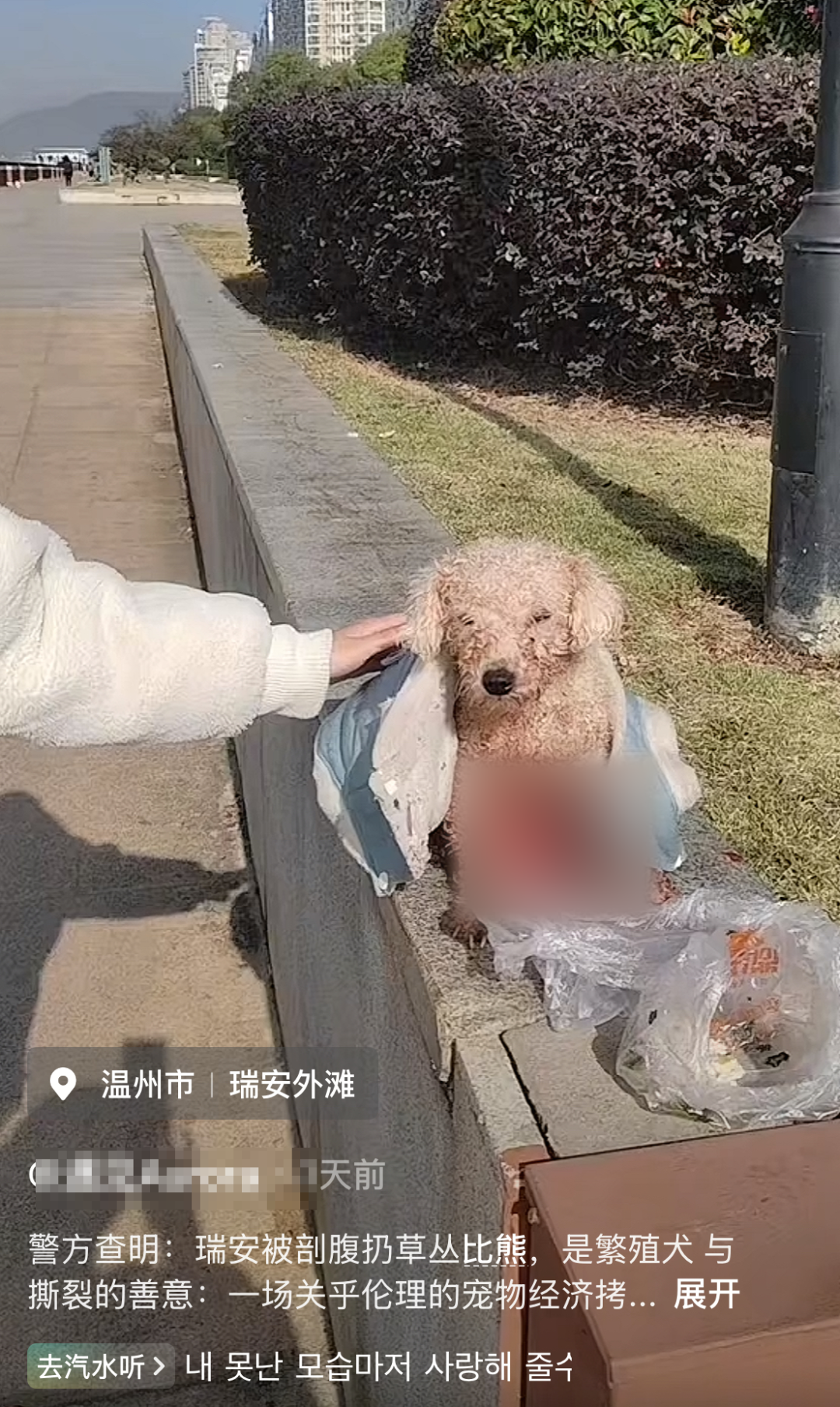 民警说,这狗是附近黑犬舍的繁殖犬。之前生崽难产,老板直接给它剖腹把俩幼崽取出来,剖腹之后又觉得后续治疗要花很多钱,于是,老板连伤口都不缝就装袋丢了!