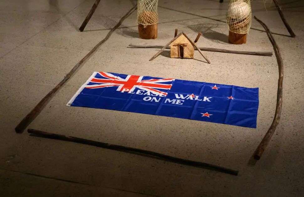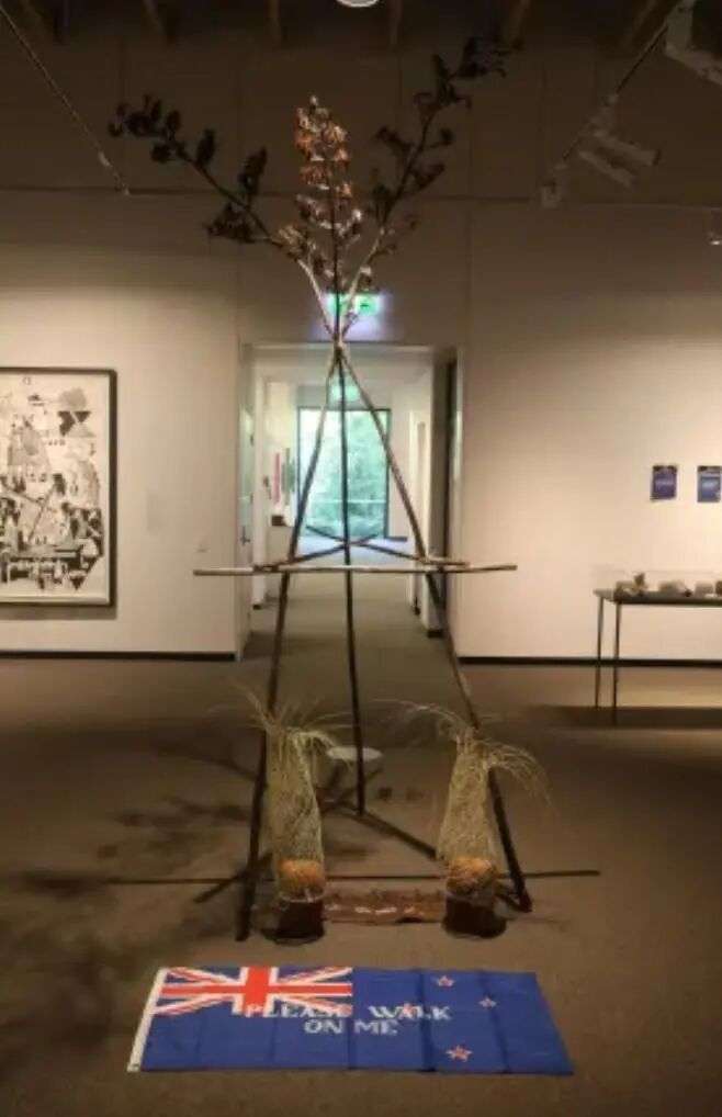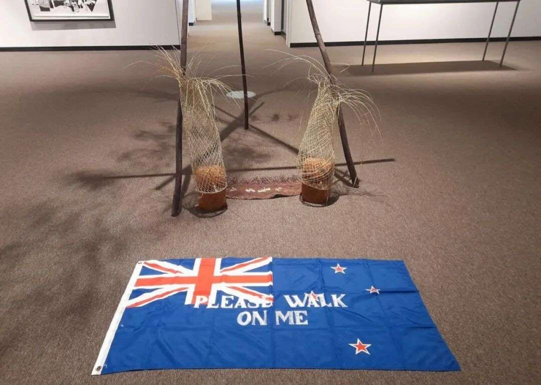 作品中最引人争议的一部分,是一面铺在地上的新西兰国旗,旁边写着一句话: