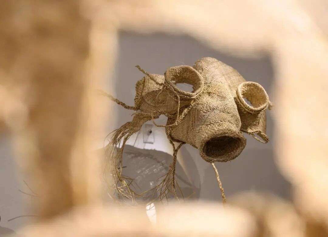 作品中还有其他元素,例如用flax(亚麻)编织的防毒面具。