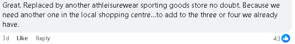 太好了,估计又要被一家运动休闲服店取代吧。因为我们本地购物中心当然“还需要”多一家这种店……虽然已经有三四家了。