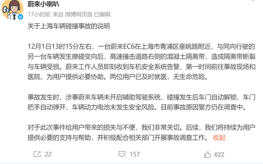 12月1日,@蔚来小喇叭 发布关于上海车辆碰撞事故的说明:
