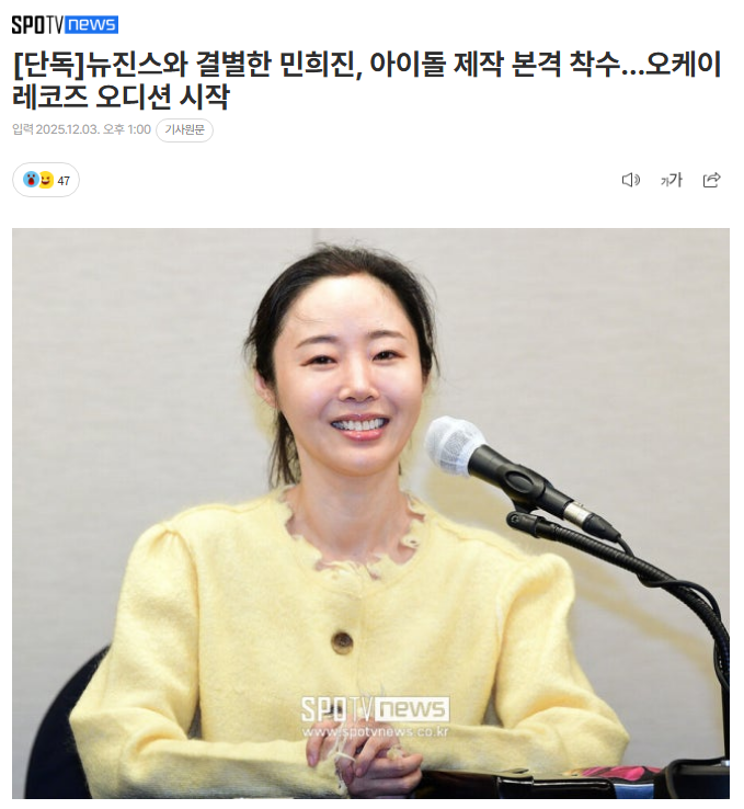 此外,闵熙珍近期在与HYBE的股东协议解除确认诉讼及针对HYBE提出的看跌期权索赔诉讼的第三次辩论日期中,以OK RECORDS名义发布新闻稿,正式宣布了公司的成立。