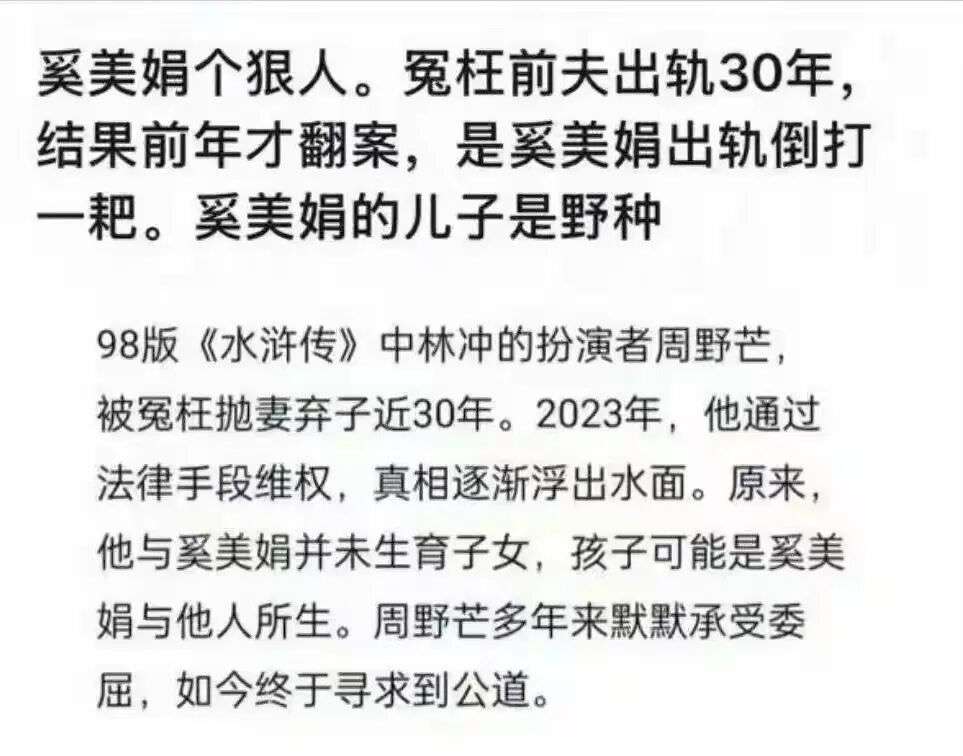 不料随后奚美娟反而对外将他描绘成“抛妻弃子”的负面形象,致使周野芒背负这样的指责长达三十多年。