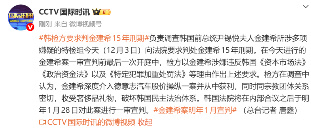 负责调查韩国前总统尹锡悦夫人金建希所涉多项嫌疑的特检组12月3日向法院要求判处金建希15年刑期。