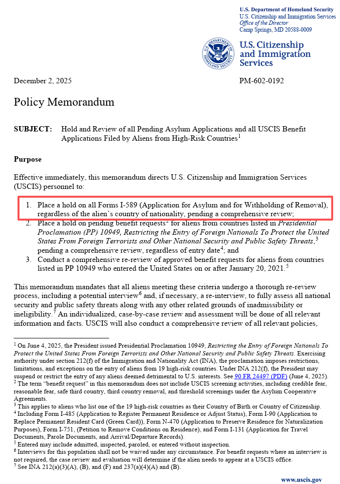 无论申请人国籍为何,所有正在审理中的庇护及禁止驱逐申请(Form I-589)全部暂停处理,直至完成安全全面审查。
