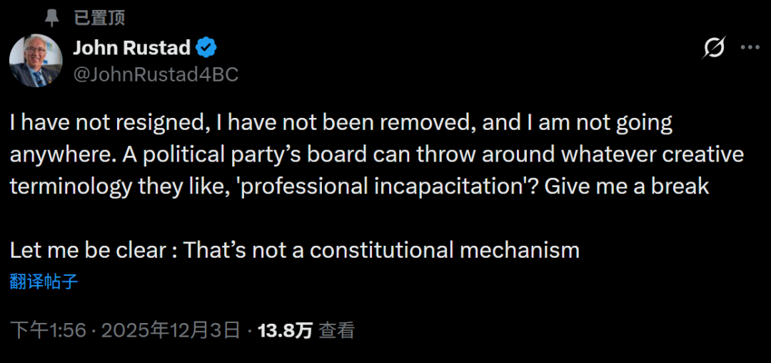 一边是20名党内议员联合“逼宫”,坚称对党魁罗仕德(John Rustad)失去信心,董事会直接宣布将其罢免,并任命特雷弗·哈尔福德(Trevor Halford)为临时领袖;另一边,则是罗仕德本人强硬回应:“我没走,我也不会走。”