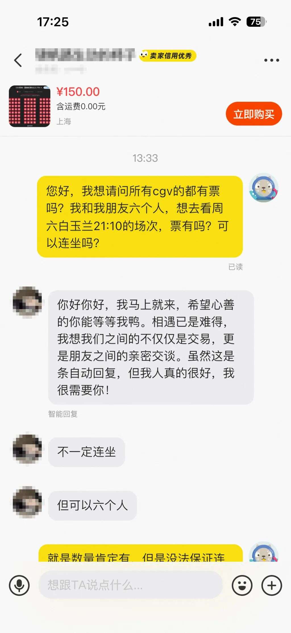 记者以消费者身份咨询上述卖家是否有6张周六CGV影城(白玉兰广场IMAX店)已售罄场次的电影票,对方表示“不一定连座,但可以六个人”。记者进一步询问,能否换个时段或者换个影院6人连座时,其表示“得下周”。对于该卖家所售影票的真实性,有待进一步证实。