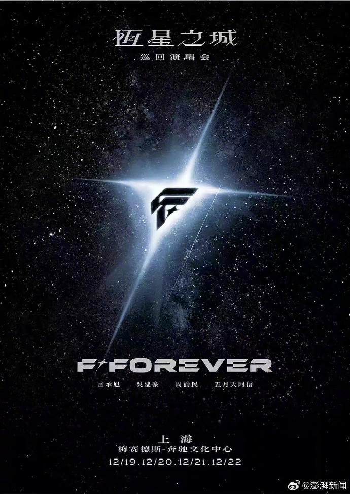 11月24日,“乐游上海”发布信息称,2001年凭借一首歌、一部剧出道并火遍亚洲的经典四人组合,2009年解散后成员各自单飞发展,2025年末言承旭、周渝民、吴建豪将以“F★FOREVER恒星之城巡回演唱会”为主题,在上海开启首站四场连开的巡演,文案中未提及原成员朱孝天。