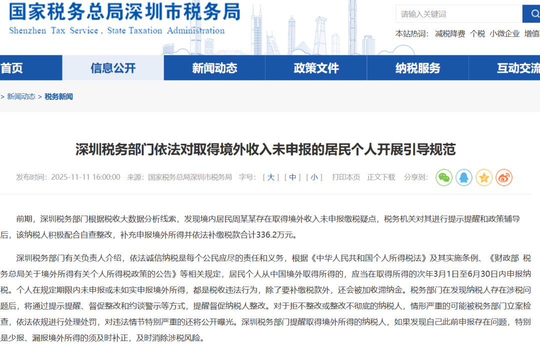 北京、深圳、广州、四川、福建、厦门六地的税务机关接连发布多起未申报境外收入的典型案例通报。