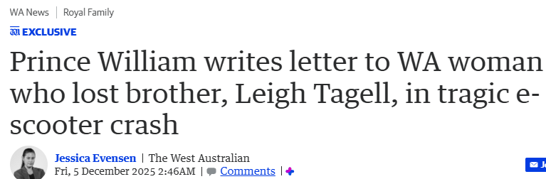 据《西澳人报》12月5日报道,一名曾在电动滑板车事故中失去哥哥的西澳女子向威廉王子写信,并意外收到王子的回复。
