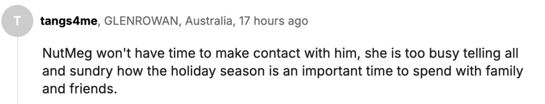 “梅根没时间联系他,她忙着告诉所有人,假期是与家人和朋友共度的重要时光。”