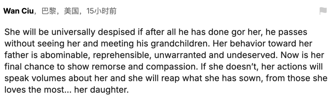 “如果在她父亲为她付出一切后,她依然不去见他、不让父亲见到孙辈,她必将遭到全世界的唾弃。她对父亲的态度是可憎的、应受谴责的,既无理又无情。现在是她展现悔意与同情的最后机会。如果她仍不行动,她的行为将彻底说明她的为人——而她最爱的女儿,将来也会让她尝到自己种下的苦果。”