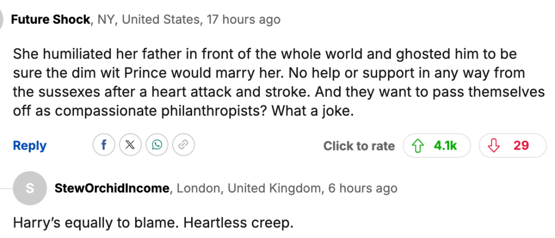 “她当着全世界的面羞辱了她的父亲,然后就对他不理不睬,只为了确保那个愚蠢的王子会娶她。心脏病和中风之后,苏塞克斯夫妇没有提供任何帮助或支持。他们居然还想把自己包装成富有同情心的慈善家?真是个笑话。”