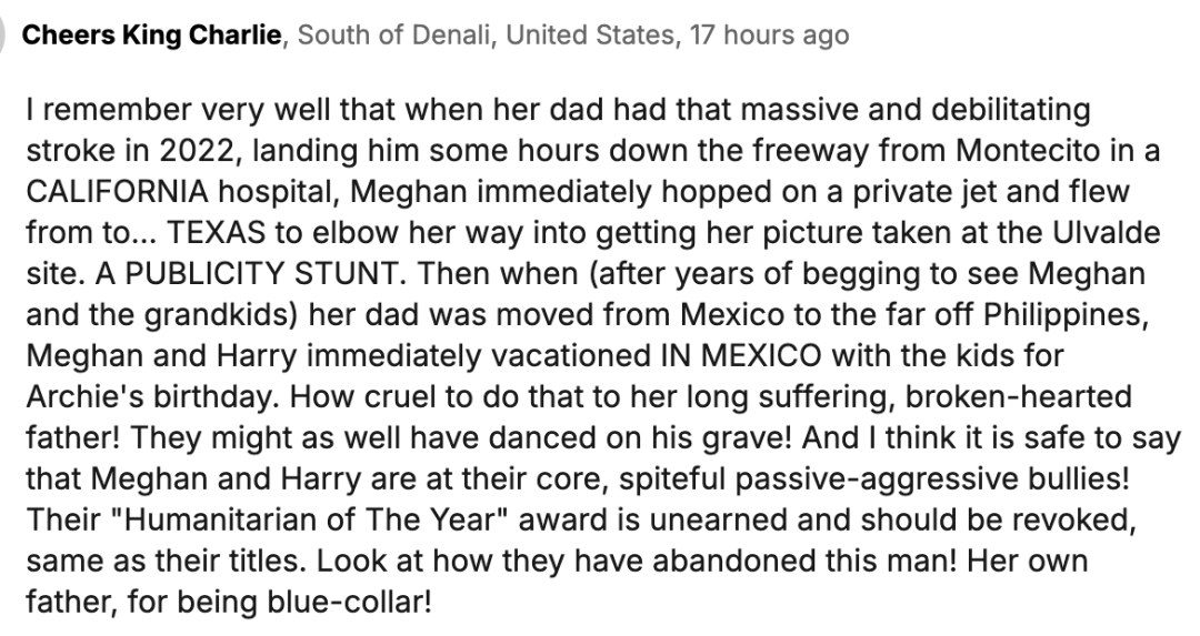 我认为可以肯定地说,梅根和哈里本质上就是心怀恶意、消极攻击的恶霸!他们获得的“年度人道主义者”奖名不副实,应该被撤销,他们的头衔也应该被撤销。看看他们是如何抛弃这位父亲的!她自己的父亲,竟然是蓝领工人!”