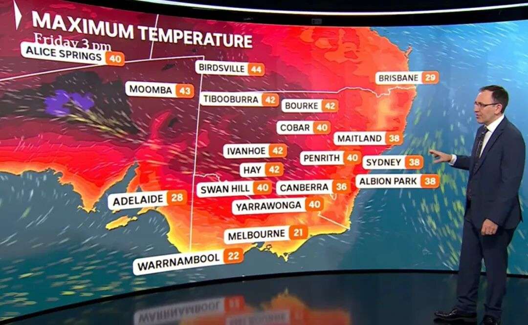 Bankstown和悉尼奥体公园等站点测得39摄氏度的高温,Penrith出现40摄氏度的高温。