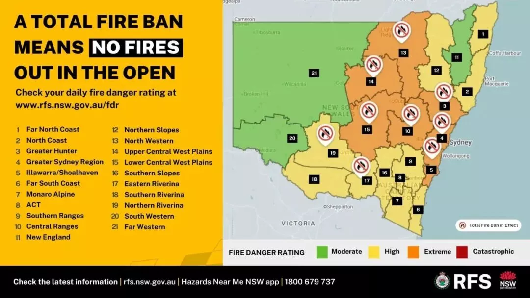 目前,新州中部,包括悉尼及周边地区在内的大片地区已经颁布了全面禁火令。