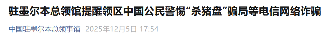 中国驻墨尔本总领馆提醒领区中国公民提高防范意识,时刻警惕各类电信诈骗和新型骗局,保护人身和财产安全。请大家及时关注中国驻澳大利亚使领馆对领区中国公民的反诈提醒: