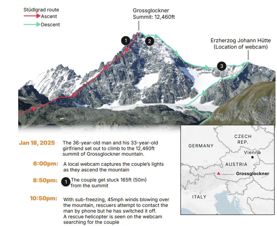 今年1月份,一名33岁的女子与她最爱的男友一起挑战奥地利最高峰——海拔3,798米的Grossglockner。
