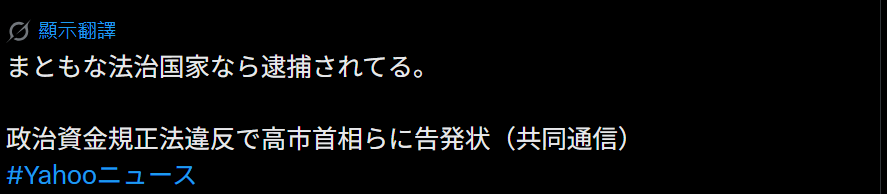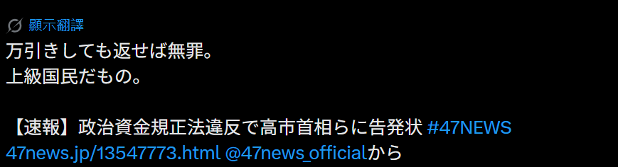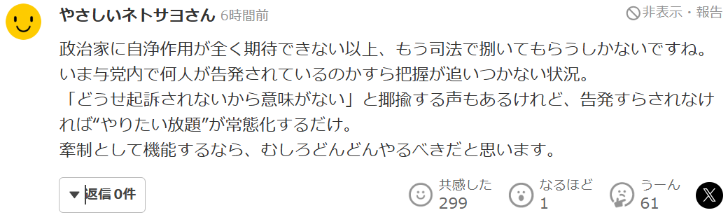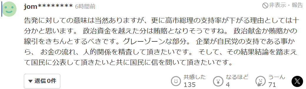 “对告发行为本身当然是有意义的,同时这也完全足以成为进一步拉低高市首相支持率的理由。超过政治资金法定额度的部分,已经很可能构成变相贿赂。必须明确划清'政治献金'和'贿赂'之间的界线,不能再让这种灰色地带长期存在。既然企业与自民党之间存在支持关系,就更应该对资金流向和人员往来进行彻底核查。并且,希望在得出调查结论后,能够向国民如实公开,同时通过重新征询民意来给出一个负责任的交代。”