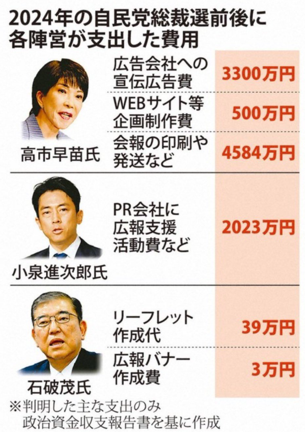 另外,高市、小泉、石破茂三人为争取首相之位花了多少钱,也被公开。
