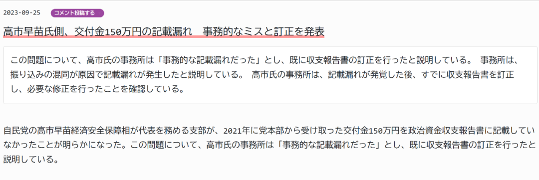 早在2023年,高市早苗方面就被发现,其担任代表的自民党奈良县第二选区支部,曾在2021年未将本部拨付的150万日元交付金记载于报告书中。